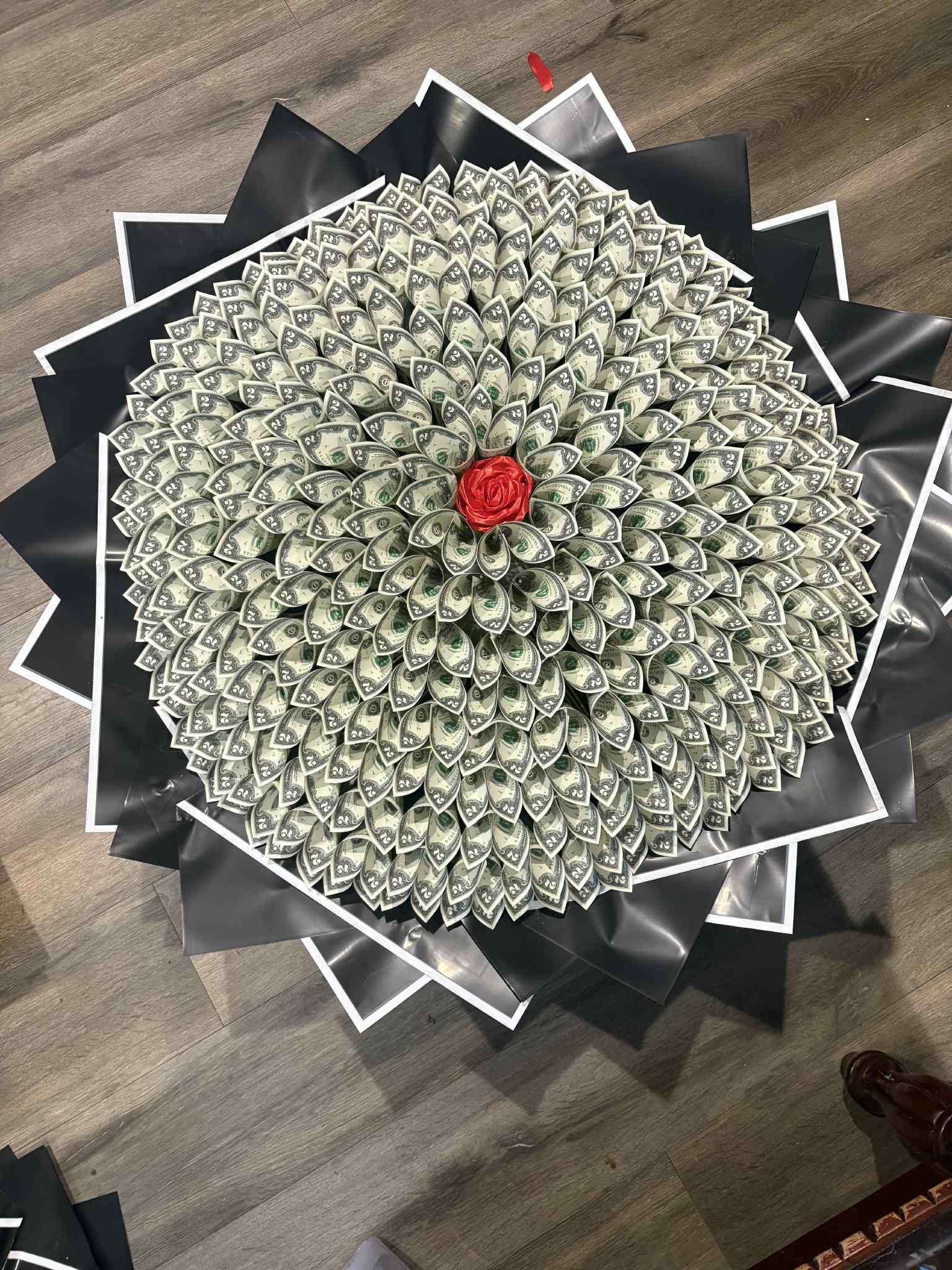 Say “I love you” with a statement. This heart-shaped money bouquet with 1 red rose is the perfect blend of love and luxury.