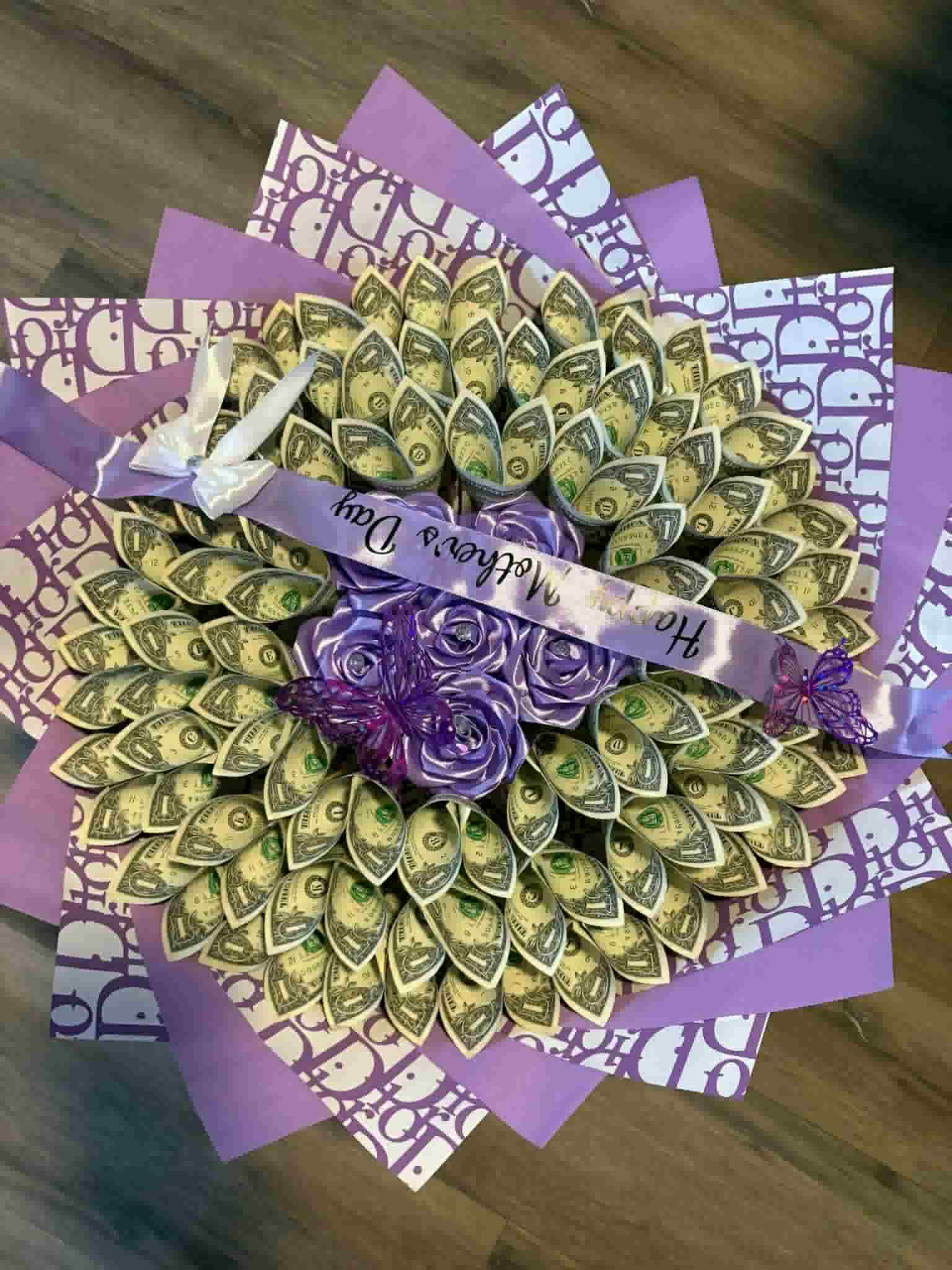This Money and Rose Bouquet is a lavish statement piece, featuring 5 luxurious roses surrounded by a wealth of folded cash, representing both love and prosperity